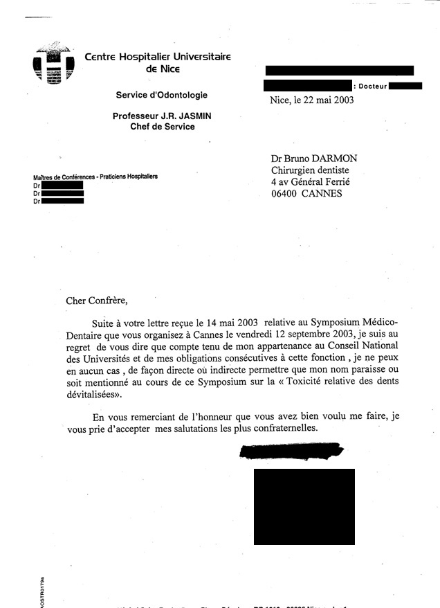 J’envoyais le projet du symposium au Conseil national de l’Ordre comme c’est la règle. Des médecins et des dentistes qui auraient pu y participer furent convoqués pour subir des pressions par l’Ordre des dentistes des Alpes Maritimes et l’Ordre des médecins des Alpes Maritimes. Un dentiste de Monaco qui prônait souvent d’enlever les dents dévitalisées et de les remplacer par des implants et qui voulait participer au symposium reçu des menaces orales des confrères de l’Ordre de Nice. Il dut se désister car selon lui, il avait plus à perdre dans cette histoire qu’autre chose. C’est en tout cas ce qu’il m’a dit et comme il l’a dit à mon répondeur téléphonique car j’étais absent, j’ai conservé l’enregistrement, histoire de le faire écouter aux journalistes qui se pencheront un jour sur cette affaire qui relève plus du roman d’espionnage qu’autre chose, comme vous allez encore le constater d’ailleurs par la suite. Le Dr J.G. Thomas, médecin rhumatologue connu dans la région pour proner depuis toujours à tous ses patients d’enlever leurs dents dévitalisées, qui était cité sur le projet de symposium fut menacé d’interdiction d’exercer s’il ne prouvait pas son désistement de ce symposium et même le fait qu’il n’avait rien à voir avec ce symposium en déposant plainte contre moi. Ce qu’il fit d’ailleurs avec mon accord. Plainte qui fut classée sans suite lorsque le procureur eut l’explication du sens de cette plainte par le Dr J.G. Thomas lui même. Mais ainsi son ordre se calma. Des confrères dentistes que je ne veux pas citer pour ne pas les mettre en danger furent aussi convoqués et menacés par l’Ordre des dentiste, tandis qu’un confrère enseignant à la faculté de Nice, décida de refuser de participer à ce symposium après avoir pris conscience du danger que cela constituait pour sa carrière professionnelle. Cet enseignant savait pourtant beaucoup de choses sur le sujet.