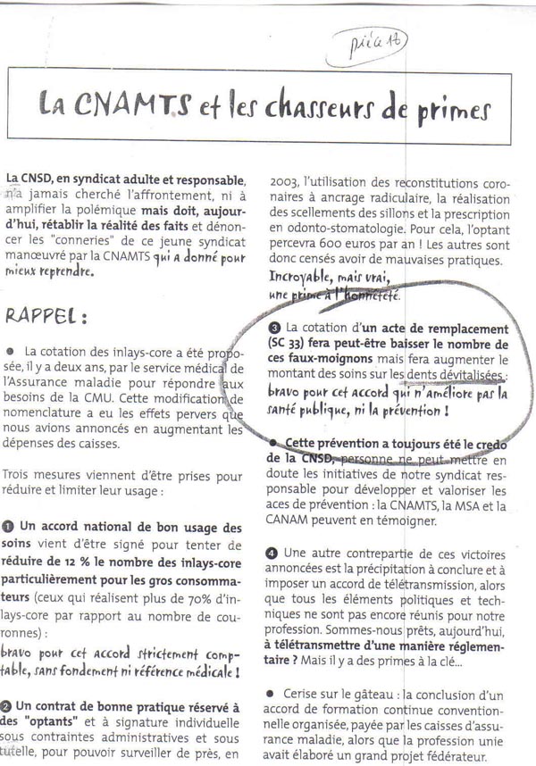 C’est fou comme le remboursement d’un acte le favorise, non…Comme le screw post, la visse mise dans la racine n’avait pas de cotation, on n’a pu chiffrer précisément l’augmentation de la mise de screw post dans les racines mais je suis sûr que si on interrogeait les patients, ils remarqueraient que bizarrement leur dentiste leur met depuis 2002 bien plus de visses dans les racines pour mieux tenir l’obturation (l’amalgame ou le composite), ou « renforcer la dent » comme on dit aussi, ça plait bien comme formule. « Ah oui docteur ! renforcez ma dent… Mon dentiste à moi il me met des visses dedans pour me les renforcer….donc c’est un bon dentiste »